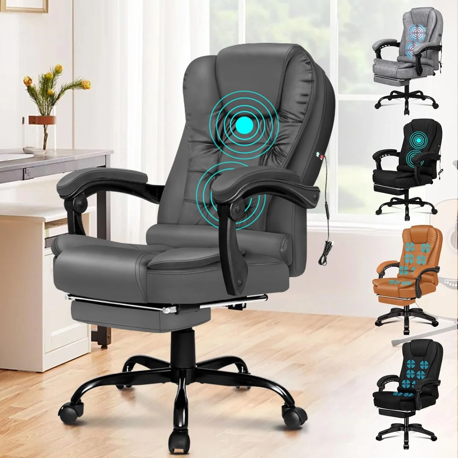 Ergonomic PU Leather Chair, Footrest, Grey, 3 Intensity Massage Modes, Adjustable Height, Retractable Footrest, 2-Point Massage.