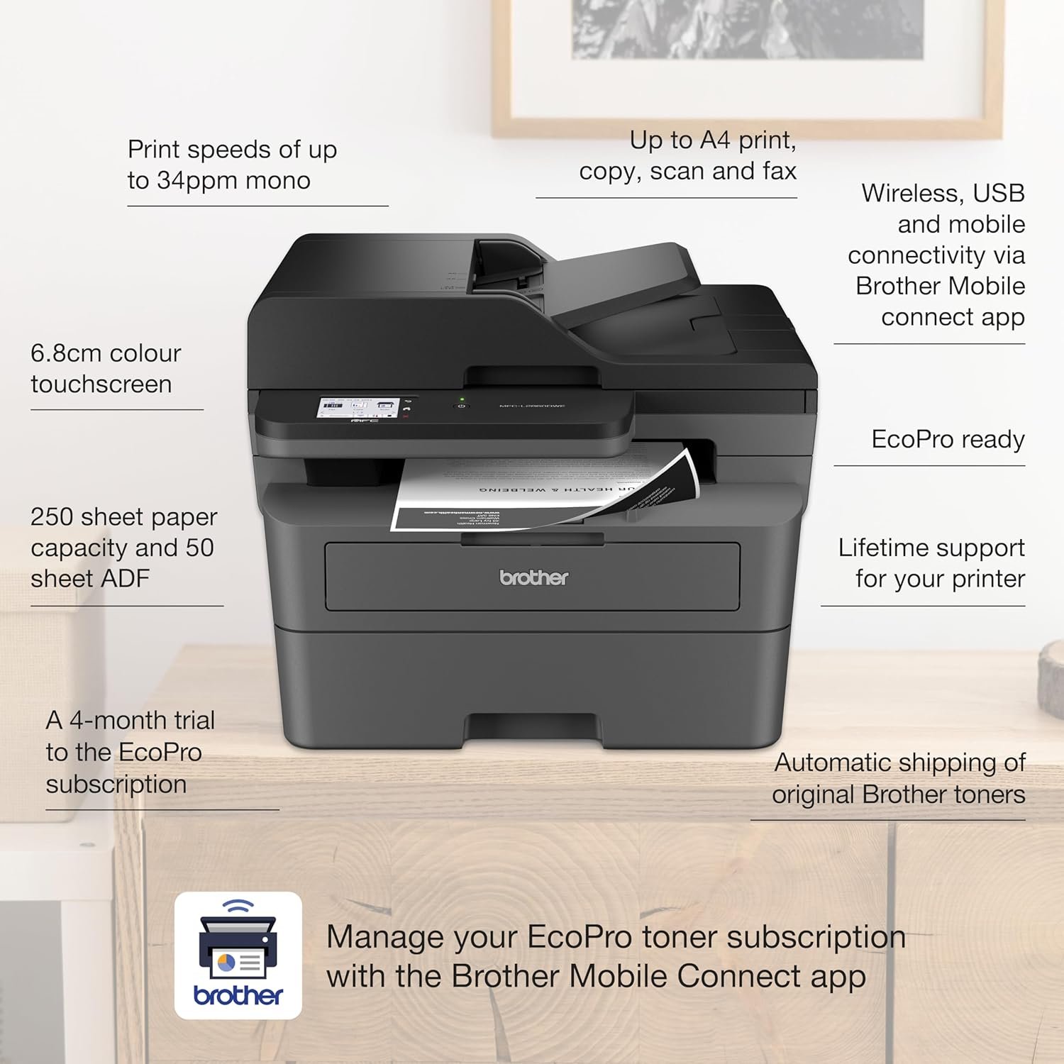 Auto 2-sided print, Print/Copy/Scan/Fax, EcoPro Subscription, WiFi/Ethernet. UK Plug.