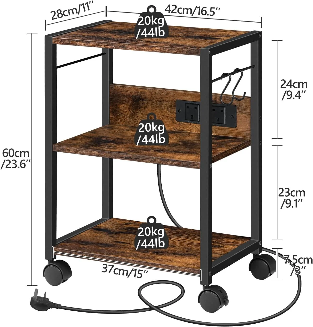 Printer Stand with Power Outlets & USB Ports, Home Printer Shelf with 2 Hooks. Rustic Brown.
